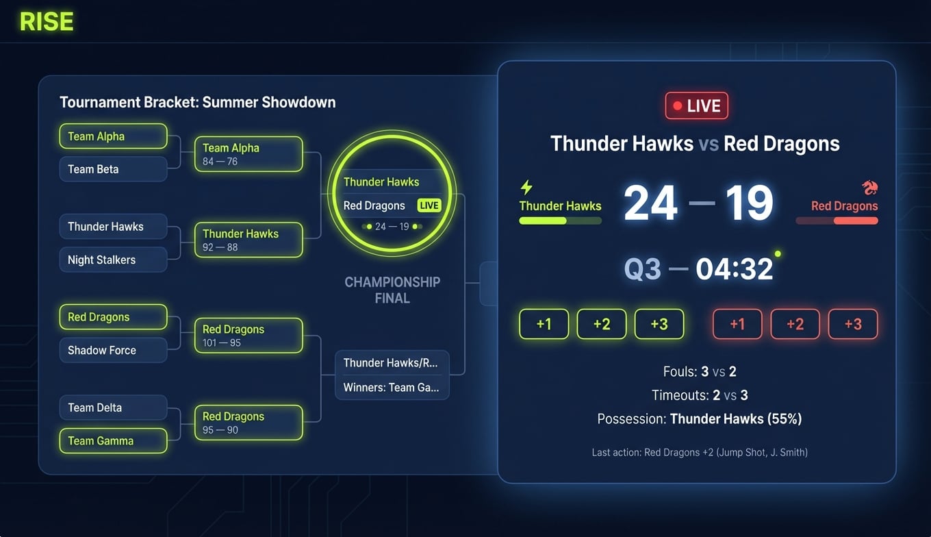 Run single or double elimination brackets for basketball, soccer, baseball, and any other youth sport. Parents follow live results on their phones while coaches update scores courtside. No paper brackets to lose, no whiteboard to erase.